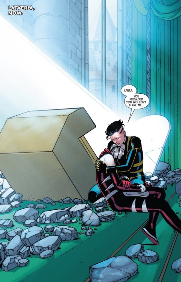 And thus Laura defeats Doctor Doom, freeing Latveria, Doom’s captive superheroes, and Bellona, and solidifying the utopia she’s dedicated her life to. She can die happy now, right? Living just long enough to see the perfect world she created through her final sacrifice, that’s her happy ending, right?