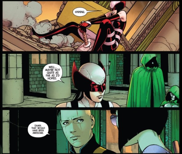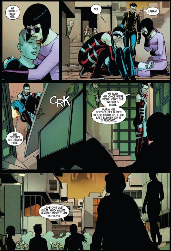 And to be sure, defeating Doctor Doom and saving Bellona are essential requirements of a happy ending for Laura. She makes that clear early in the issue as she and the rest of her party (Honey Badger, Hawkeye, Captain Marvel, and Wasp-in-a-Doombot) stop to mourn Maria Hill.