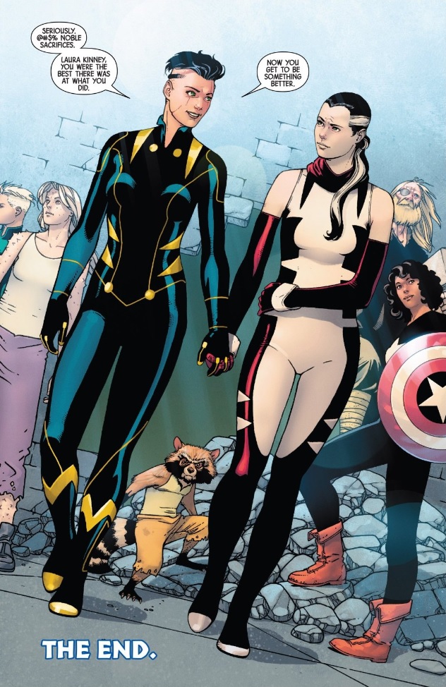 Laura has truly earned a happy ending. Doom’s bid for immortality was doomed because it benefited nobody but himself, and because he hurt others to attain it, but Laura’s chance to keep on living is a reward for quite literally bringing about a utopia. In fact, in a way it’s not even the ability to keep on living that’s her reward: it’s the opportunity to become something even better than she already is. The chance to keep on growing, evolving, and helping others — that’s the only fitting happy ending for Laura Kinney. It’s certainly the only fitting ending for All-New Wolverine.