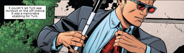 It’s an odd excuse to get Matt out of the mind reader’s grasp and sidesteps a conflict by referencing a happenstance from the Frank Miller days.