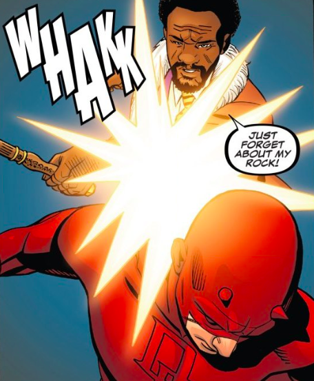 When he commands Daredevil to forget however, that particular blue flourish is curiously missing. It’s only on the next page when Daredevil’s radar sense can no longer detect the stone that we see Turk had used his power to make him forget.