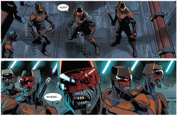 While their matching looks and personalities are a boon to the issue, what’s striking is how dehumanized these guys are. Sure, they’re aliens, but the design of their costumes seems to purposefully mask any sense of humanism or individuality any of them might have. Just look at how those helmets mask their face, eyes, and head. Paired with their matching uniforms, they might as well all be the same guy.