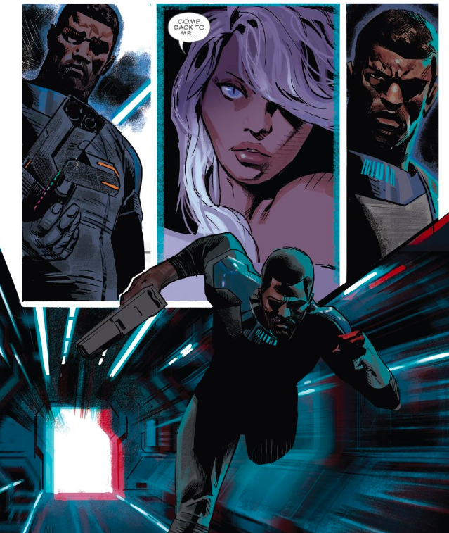 Acuña’s talents are well-suited to the sci-fi realm, with a combination of reds and blues that remind me of the 3-D comics of yore. Though Coates’ dialogue certainly propels the narrative, a lot of the work is done by Acuña — given the fact that T’Challa is mostly silent throughout the issue.