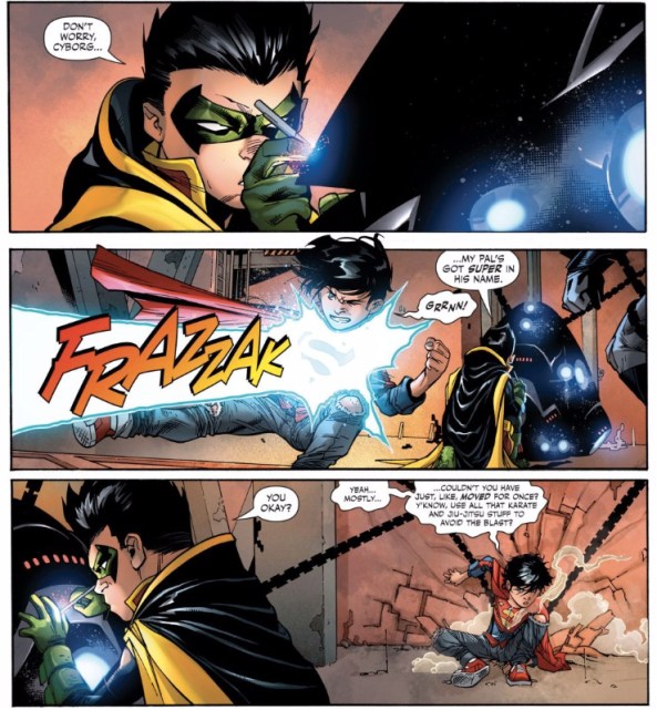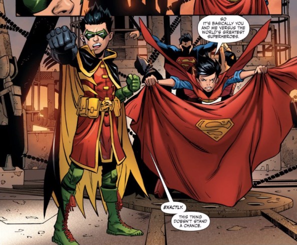 Jon and Damian still bicker (hilariously) of course, and each still marvels in the other’s drastically different worldview, but they also trust each other and rely on each other in a way they never did before. Tomasi plays it for laughs in the scene above, but Damian is so confident that Jon will protect him that he doesn’t even attempt to dodge Kid Amazo’s blast — and Jon doesn’t let him down. Damian is likewise fully confident that Jon can pull off the physical portion of his plan, and Jon trusts Damian enough that he doesn’t even question the plan. Their partnership has grown in remarkable ways, without losing the back-and-forth that has made this book so much fun. That’s impressive.