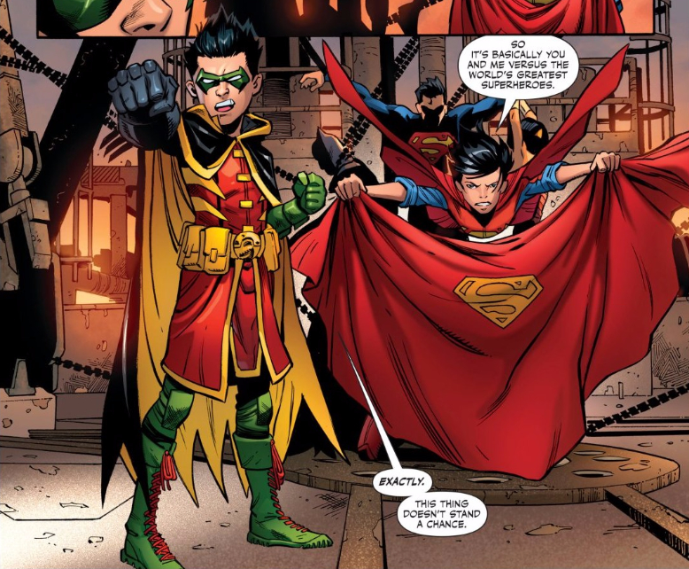Putting the Super Sons in their iconic fathers’ shoes shows how far they’ve grown as heroes, as does them saving the entire Justice League; they definitely leveled-up this month. While the gear they need to stop Kid Amazo comes from their fathers, though, it’s Jon and Damian who follow through with the execution, and they’re able to do so because they finally, truly trust each other as partners.
