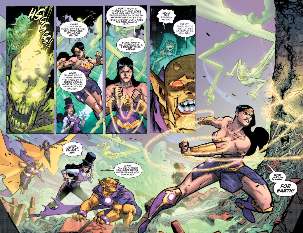 Team Wonder, meanwhile, succeeds because they’re all able to rally behind Wonder Woman. They can believe in her when they can’t believe in themselves, and it gives Diana the power to reignite the Tree of Wonder. I love this use of Diana as a leader and an inspirational figure because it mirrors the role she’s taken on in real life since her movie was released, but also because it taps into the idea of magic as being powered by raw belief, and free of limitations. Diana isn’t inherently magical in the way that Zatanna or Raven are, but she’s able to inspire others, and that creates limitless energy. It’s magic in its own right.
