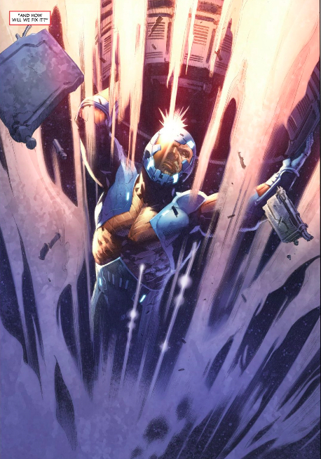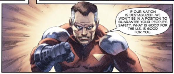 Aric blasts onto the scene saving earthbound satellites against a monologue about “humanity look[ing] to the skies in horror.” He’s snatching a G.A.T.E. satellite out of free-fall here, which effectively means he’s working for a global government agency. Aric is also freshly back from some adventures in outer space — adventures that he’s not eager to discuss. So he’s a private dude, with access to advanced alien technology, with a default mode of helping out the government. He’s Superman. The scene aboard The Loveboat only enforces his connection to some implicitly and explicitly American ideas and values. The first one is kinda subtle and tumbles out of G.A.T.E. leader Colonel Jamie Capshaw. Here’s how she thanks X-O Manowar: