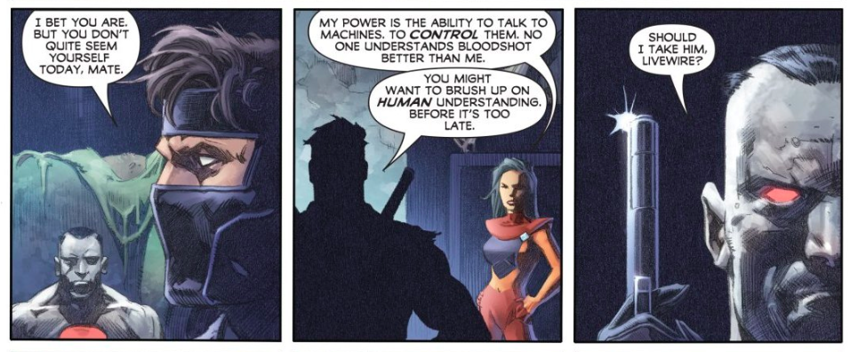 Livewire may not be an out-and-out villain, but she is certainly the more unpredictable of the two sides in this war. But she kind of had to be, right? Palmer and his team have the full might of the world governments while Livewire and her Renegades are a rag-tag band of fugitive rebels. To pose a threat, Livewire needs to up the ante and make some more drastic decisions. And that includes having her own personal kill machine: Bloodshot.