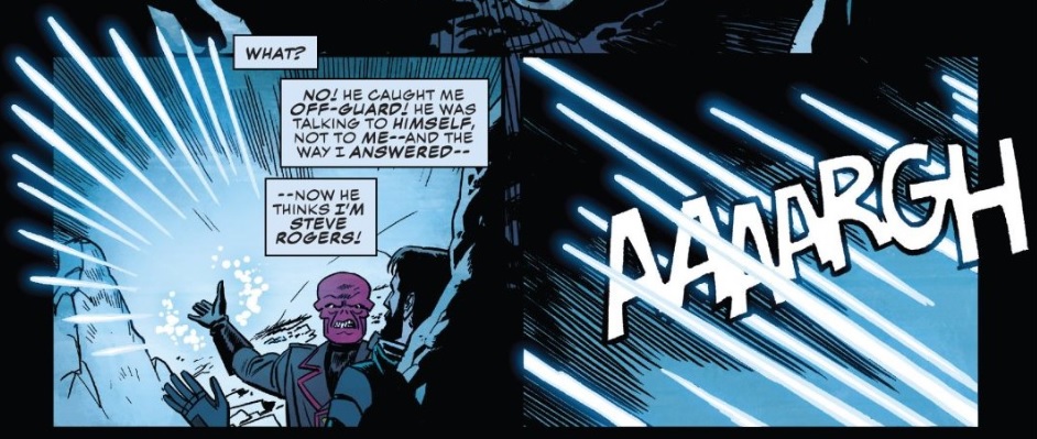 Unfortunately, this is the only intuitive element of this flashback. There’s no in-story explanation given for it — no character within the story is remembering or being told this story, which draws attention to the fact that Waid specifically wants readers to see this story. The reason why, though, is a mystery to me — the flashback has no bearing on the present-day story, neither thematically nor when it comes down to plot details. The closest explanation I can find comes when Melter refers to Cap’s Avengers teammates (Hawkeye, Scarlet Witch, and Quicksilver) as criminals, which I guess could be meant to be a parallel to Jackson working with the criminal Red Skull — but that’s a weak, weak parallel, as none of those Avengers were ever as monstrous as Red Skull, and at this point in their history have all been reformed anyway.