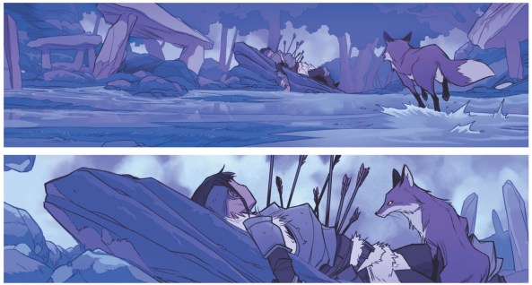 The issue opens with a dream sequence; Olwyn — back in human form — wakes up in a mostly dry riverbed. On a rock in the distance lies Rook’s dead body, riddled with arrows, a tell-tale fox keeping her corpse company.