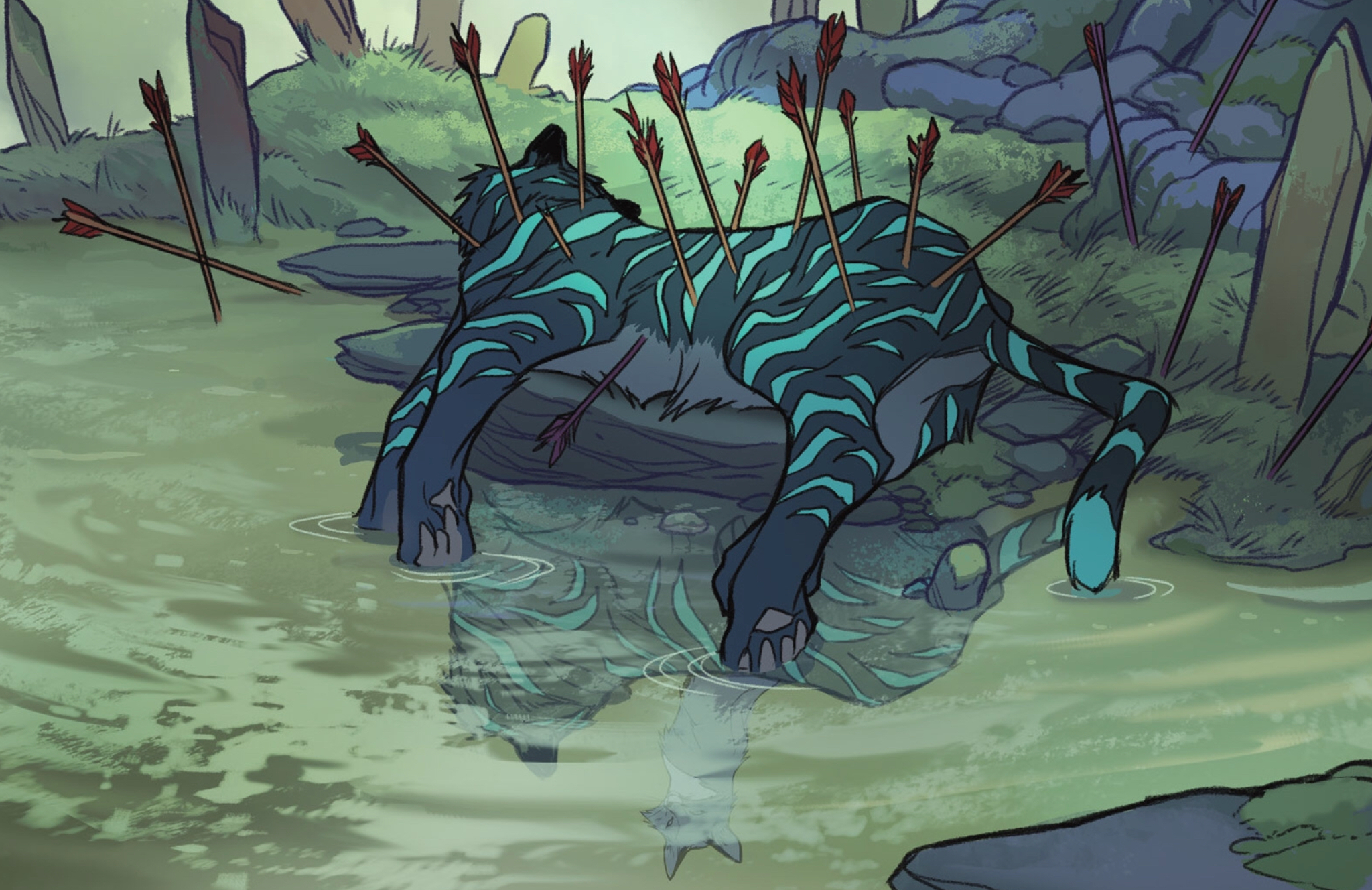 This vision not only mirrors the opening pages of Isola 1 (where Rook experiences a similar vision with the roles reversed), but also creates symmetry within the issue itself. In the final pages of Isola 3, Rook experiences another vision, one that articulates the pain and guilt she feels without offering any details as to why: Olwyn emerges from a rocky pool, transformed back into a human save for her tiger head. As Rook tries to comfort her a single word escapes her mouth in a hiss, “Murderer.”