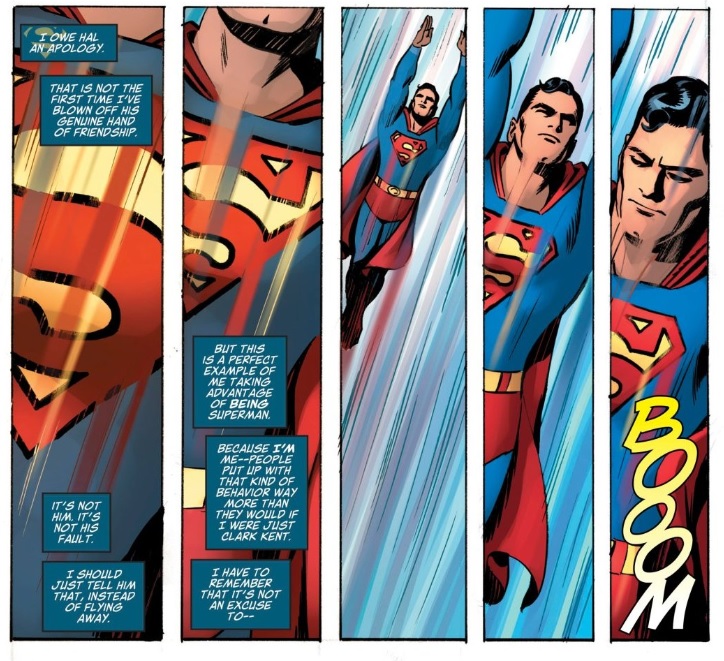 He notes that the way he ditched Hal “is a perfect example of me taking advantage of being Superman.” Thus far Bendis has depicted Superman as an effective model of superhero productivity. Clark is often running/flying off so that Superman can best tackle the problems that are immediately threatening Metropolis/the world. In theory, being Superman is the perfect excuse for dipping out of an unwanted situation. However, I don’t think Hal is buying it.