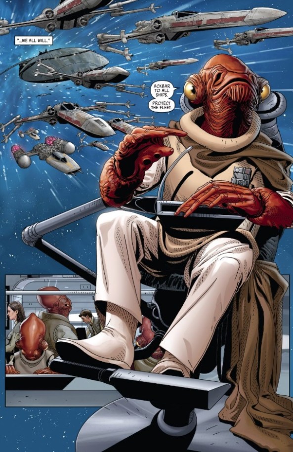So, the medium is doing some of the work for our creators. Gillen and Larroca goose the connection between the characters and their ships by depicting them both freely floating in space. Sometimes this is literally true: Urtya’s fishy-droid assistant floats around Urtya’s watery chambers. And sometimes, it’s Larroca having fun with the space on the page, like the Admiral Ackbar introduction, where it seems like Arkbar himself is sitting alongside his unstoppable space fleet.