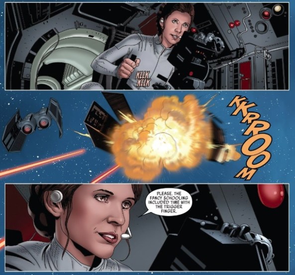 Larroca, like many Star Wars directors before him, rapidly cuts between ships’ interiors and exteriors. But Larroca finds a bunch of other ways to link his cast to their weaponized vehicles. Because this is a comic book, the reader is able to see an entire page at once, meaning that instead of feeling like a series of rapid cuts, we are witnessing what’s happening inside and outside of the ships simultaneously. Let’s look at how effective this when Leia blows up a TIE fighter with the Millennium Falcon’s dorsal gun turrets.