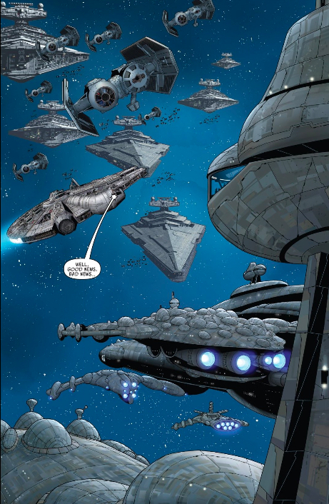 There are something like 20 ships drawn in Larroca’s excruciating, tracerly detail, with dozens more dotting the starscape behind them. Besides the Falcon, they are largely faceless ships. You can determine what side they’re on by their geometry — the good guys are round and bulbous, the bad guys are sharp and angular — but at this point, they’re all just pieces on a board. Even the way they hang in space, with no reference points to establish speed or position, presents a storytelling challenge.