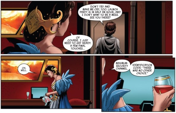 I think this idea of doing whatever it takes to survive is something that Trios understands. If anything else, the Queen has shown that she is a survivor, which means she may be loyal to no one but herself. If this is the case, it makes sense for her to be colluding with Vader to end the Rebellion. We all know what Vader is capable of doing to those who cross him, as does Trios. Can we really blame her for fearing the wrath of the Lord of the Sith? If it’s any consolation, it seems like she would rather be teaming up with Leia than Vader, anyway. After Leia leaves Trios to herself she contacts Vader using a super secret, secure channel that has a cryptic password.