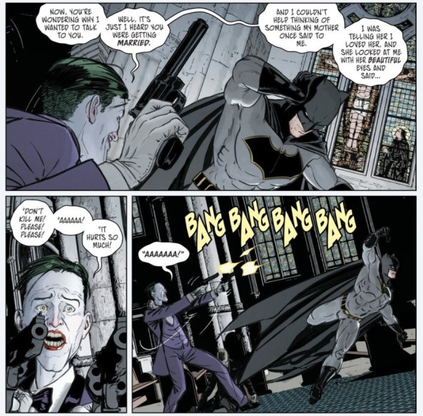 The jokes become more traditional from here on out, but no less morbid. The next page finds the Joker taking a bride hostage, “accidentally” shooting her in the head before he can even finish warning Batman to back off. I’ll admit that I had to choke back laughter here — especially because Joker himself looks so surprised by how things played out! — but then I also felt really bad about laughing. These kind of jokes continue throughout the issue, culminating in one that’s just about perfect.
