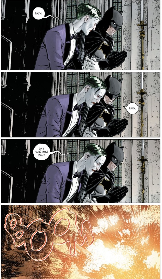 It’s a joke whose set-up actually began all the way back in DC Nation 0, where Joker learned of Batman’s upcoming nuptials and tortured and killed a man while waiting for his invitation. Joker’s showing the same kind of madness when he attacks this church just to attract Batman’s attention; Joker’s so unhinged, and such an agent of chaos on even his best day, that the audience likely isn’t questioning his motives. He’s the Joker — he’s obligated to crash Batman’s wedding. Then the issue hits us with this: