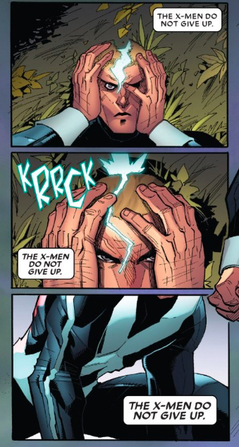Sandoval relishes the opportunity to show the X-Men at their absolute lowest. All of their psychological wounds are self-inflicted, resultant from self-doubt or a sense of low self-worth, and Sandoval establishes a devastating visual vocabulary to illustrate this. Before we even get a credits page, Logan takes the iconic Wolverine-suicide pose and snikts his claws through his chest.