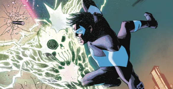 Wyrm’s plan to hack all of Bludhaven’s personal information comes in the mass delivery of a VR device known as Phantasm. With Phantasm, Wyrm will gather data on a person’s life — including bank and financial info, but also their secrets. The underlying threat of Wyrm’s virus is that of identity theft, extortion and blackmail. But the immediate/more interesting threat that Percy and Christopher Mooneyham craft for Dick Grayson is how he begins to question his own reality.