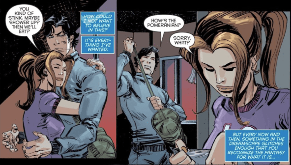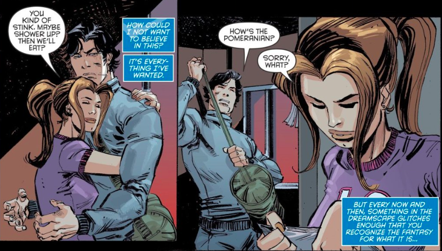 Wyrm’s malware has been uploaded into Dick’s brain and is altering his reality as it slowly downloads his “data.” He forgets that he was attacked by his Phantasm device and appears to be the victim of a wicked hangover. He also wakes up in bed with Barbara Gordon, or the virus disguised as Babs. Wyrm poses as Babs as a way to distract Dick from realizing that his brain is being hacked. It has given him “everything he ever wanted.”
