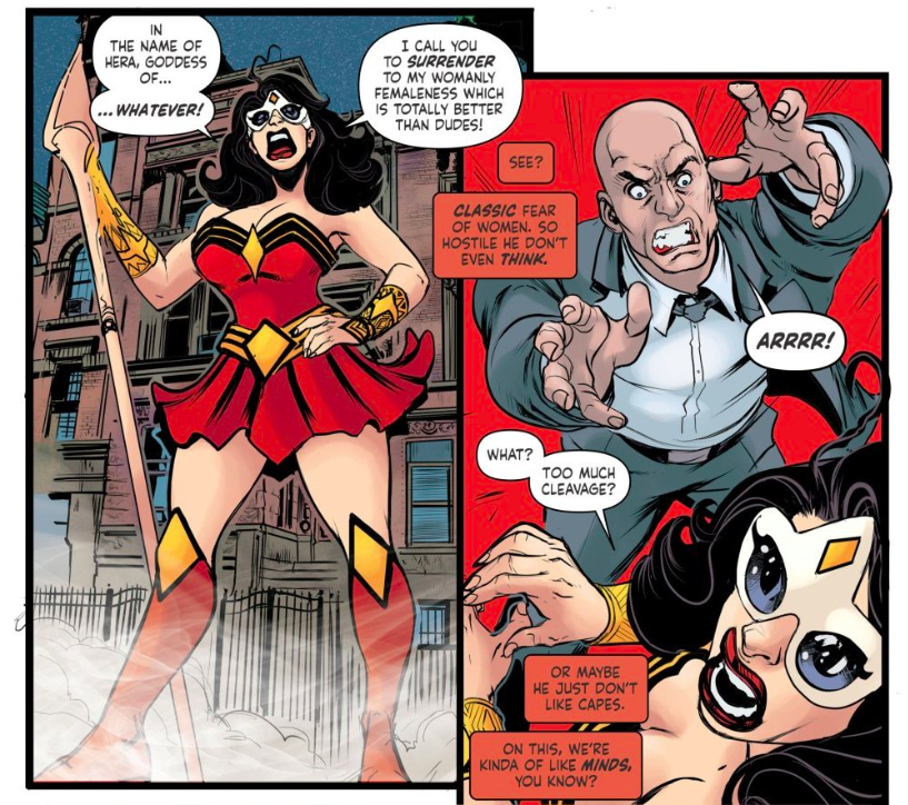 As for the wang slang…I’m not crazy about it. It’s a joke that we’ve seen before: a character tries to sound cool by repeating some phony slang he heard but only ends up looking foolish. That joke can work, but here it doesn’t for me. Plas being semi-self-aware of what wang could mean takes the air out of the whole thing. And…I was kind of shocked that a DC superhero book got away with publishing the word “penis.”