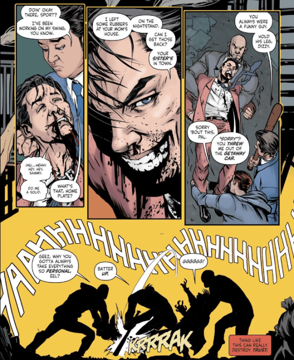Does Plastic Man usually bleed? I didn’t think so. He gets beaten bloody and left in an alley sometime after he “comes back from the dead” so you would think that baseball bat just bounce right off of Eel, right? Or is he just putting on a show here?