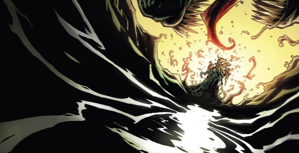 The issue ends with Eddie running headlong after the symbiote god which is terrorizing Manhattan: