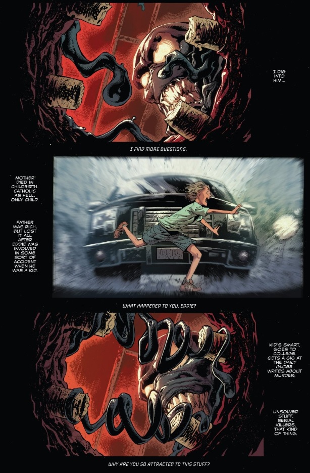 The issue opens with our protagonist, Eddie Brock, unconscious after being attacked and impaled through the heart by an infected symbiote. Brock suffers from a literal hole inside of him — a hole caused by a symbiote (symbiotes being his substance of abuse) and also a hole which, on many levels, only his symbiote can fill: