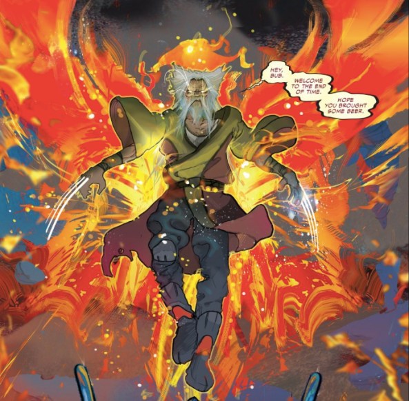I love this design. Ward commits to the monastic look of an immortal Wolverine in possession of the Phoenix. Even this line about “hope you brought some beer” sorta jukes our expectations. We’re at the solemn end of life in the Universe, but that doesn’t mean we’re out of levity.