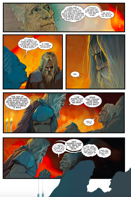 And actually, I preferred the King Thor story. Thor’s granddaughters are always a delight, but it is the way Ward can so easily slide between cosmicness and personal. I disagree that Ward’s art can in any way be compared to del Mundo’s, as I think they are going for two different effects. This isn’t the more stately version of del Mundo’s insanity, but art constantly meditating between the infinite and the finite. You have the infinite cosmos, the near immortal gods and the very mortal humans, and Ward finds ways to constantly places two next to each other to show mortality in the face of immortality. Even in a dying universe, King Thor looks minor compared to the cosmos around him. But with Jane, King Thor looks immortal and beyond us. Ward’s art always creates this awareness of something greater, an awareness of how mortal we are compared to everything else. Which is perfect for a story all about how the most immortal thing, the universe, is finally dying