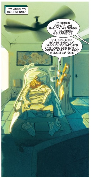 Mike del Mundo’s art also helps to make this Thor series feel immediately different from its predecessor. To start, del Mundo’s art is more elsastic that anything the artists on Mighty Thor did. This at once gives the issue a feel that is more lighthearted and not quite as cosmic and epic what came before it. While that shapes the tone greatly, what I appreciate more is the fun, little things del Mundo adds to his work to lighten the tone and make it buoyant. As with Aaron’s writing, he does things which endear us to the characters, like drawing Volstagg too big for his hospital bed so his feet hang off the end.