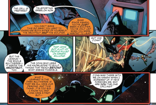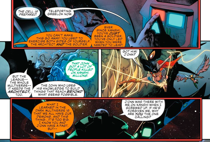 I like the fact that Snyder dug deep into history and recalled that Martian Manhunter was with John at Xanshi, giving them a potential conflict, but I don’t like the harping on “John let Xanshi die.”