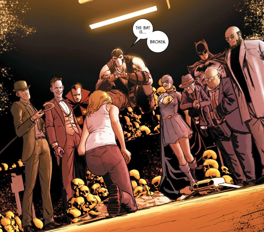 But this comic jsut acts as proof for why them getting married now would be so wrong. Selina stops being a prop for Bruce and becomes a prop for Bane, because that’s what women are in this run. Fitting the final panel is Holly bowing to Bane. There is a long, long list of characters that have been screwed up by this run, but none more than Holly Robinson, who may be broken beyond repair. So her total submission to Bane is the perfect representation of this book. Female characters broken for the sake of being props for male characters.