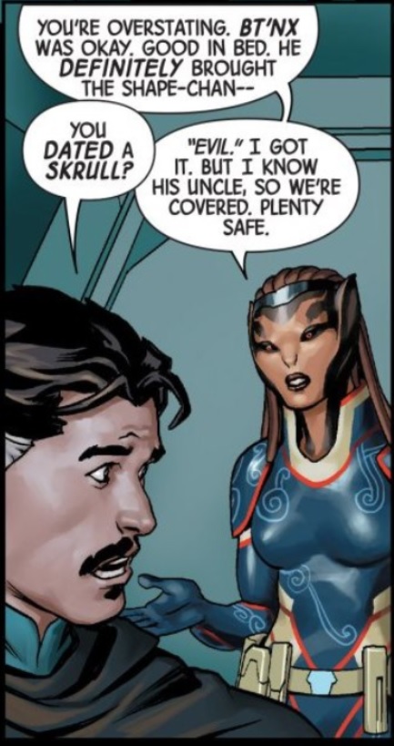Before this, Kanna told Steven that they would be visiting a Skrull planet and he voiced his reticence to do that. In trying to quell Stephen’s fears, Kanna then launches into a discussion of her sex life with a shapeshifter, as if that really has anything to do with making Stephen feel less fearful. This dialogue hints at something ugly in the way Mark Waid is having Kanna speak. By having Kanna mention her sex life off the cuff, Waid has reduced her to something close to a sex object. This is so because there’s no reason why Kanna, in vouching for Bt’nx would mention that he’s great at sex. It would be like if I was introducing my friend to a complete stranger and mentioned that he’s a great lay. It’s just weird and unnatural and isn’t the way any reasonable person would speak.