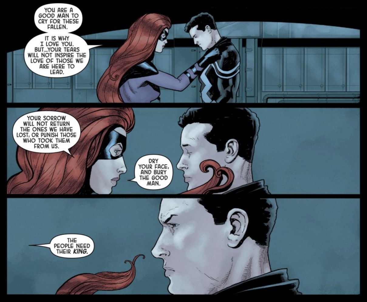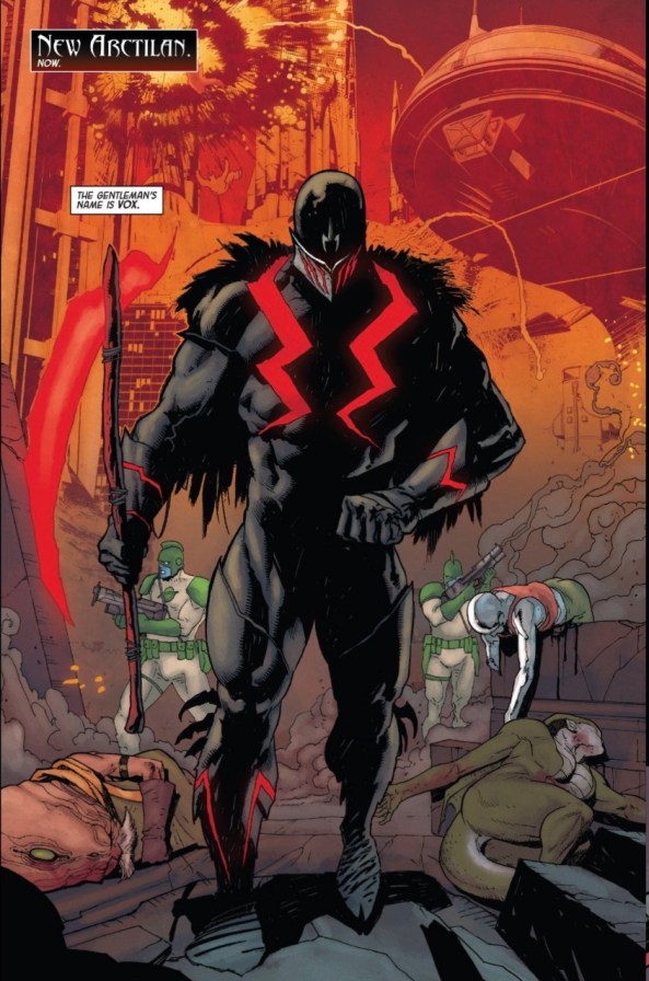 What is reiterated about Black Bolt in this story is how heavily each loss weighs on him. He carries a book with thousands of names written long hand to force him to acknowledge each of the dead. Vox is positioned as the opposite, he has no empathy, no humanity and no remorse. Meanwhile, we see Medusa urge her husband to bury the “good man” in order to act as King.
