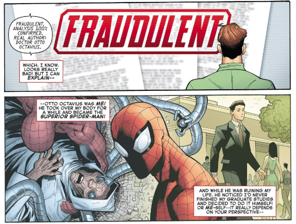 The problem with this arc, though, is it is not built on character, but the meta discussion of Spiderman canon. For all the humanity SPencer writes Peter with, the actual arc has not human element, it exists merely to discuss what should and shouldn’t be canon. The arc is actually ‘This is what should be canon -> This canon is bad -> Therefore we correct it’. Which isn’t dramatic storytelling.