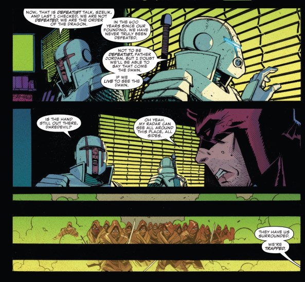 Soule and Henderson will end up applying that question to Daredevil and the Ordo Draconum, to Commissioner Karnik, and to the exiting-Mayor Matt Murdock. These are all heroic witness-to-participant turns, so they’re automatically feel sort of prescriptive, right? When Uncle Ben tells Peter Parker that “with great power comes great responsibility”, we can recognize that as a lesson for the reader as much as a lesson for Spider-Man. Henderson takes that a step further, explicitly putting the reader in the perspective of Father Jordan and his Dragon Order. We see out through the blinds of the bodega they’re holed up in, and the blinds end up creating a set of extra panel dividers.