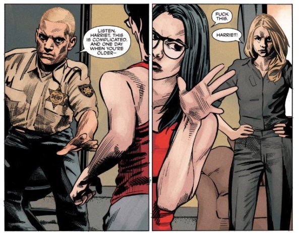 There are two central relationships at play in this issue: Harriet and Renae, and Vil and Ellis. Harriet and her mother have a strained relationship, and it’s clear that they just keeping missing the opportunity to meaningfully understand each other. The issue opens in the middle of Harriet’s drunk driving escapade before staggering back into an explanation of what lead her to this point. Higgins’ narration says part of the reason she gets in trouble is that Harriet likes “to test boundaries” and we can see that reflected in the way Mooney tells this story. A page of blue panels is interrupted by one violent red panel, and Mooney selects erratic camera angles, creating a sort of visual cacophony. That could be an expression of Harriet’s rebellious nature (or her inebriation), but my favorite bit of visual discontinuity comes later in the issue, when Harriet is talking to Mr. Carlson and her mother.