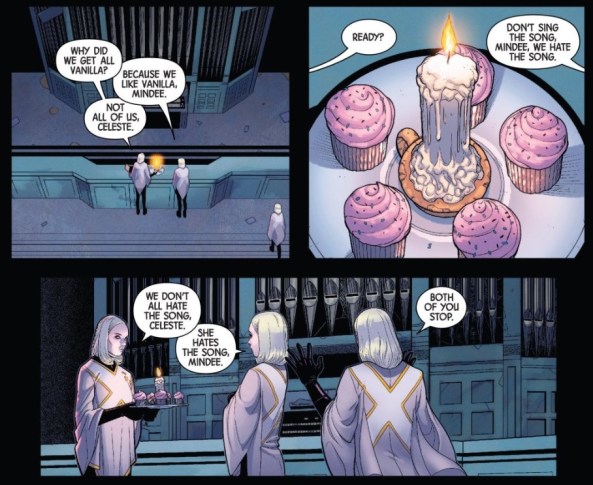 After all, it’s that kind of regression, that loss of their unique identities, that makes the Cuckoos the issue’s antagonists. The longer the characters have been around the more they’ve built unique identities, but those identities fly out the window in this issue, and that’s a planned, purposeful decision on the Cuckoos’ part. They want what they once had, not only their once-dead-now-revived-but-once-again-dying sisters Esme and Sophie, but their identical aesthetic as well. The only problem is that what once came easy to them is now forced.