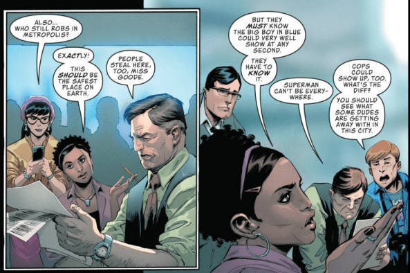 Daily Planet gossip columnist Trish Q and newcomer Robinson Goode act as the outsider perspective, asking a question that many readers probably have themselves: “Who still robs in Metropolis?”