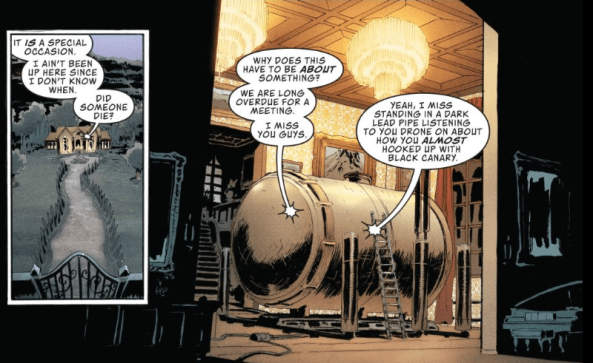 Action Comics 1001 shows that just as Bendis has to get creative at working with/around Superman’s powers, the criminals do too. In order to avoid detection from the big blue Boy Scout, the heads of Metropolis’ crime families meet in secret in a giant lead pipe.