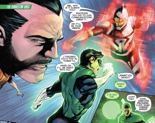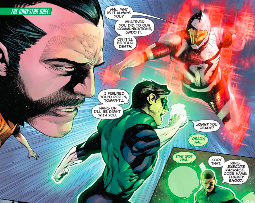 When former Green Lantern and current murderous Darkstar Tomar-Tu confronts him, he also comments on the inescapable Hal Jordan.