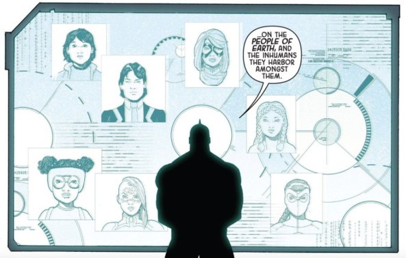 It’s a sad state of affairs, but it is sort of a safe sadness, right? I like the Inhumans, but I can recognize that the royal family as depicted here have become increasingly insular over the course of their run. In terms of other heroes in the Marvel Universe, who will mourn when these five are dead? The nameless Kree commander that greets Karnak seems more than happy to remind the readers that “Inhuman” has come to mean so much more in the last several years. He stands in front of a monitor that reveals the faces of everyone else who is vulnerable.