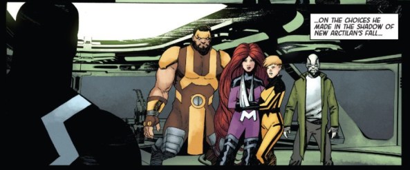 Of course, he crumples that list up. He puts the loss out of his mind before pivoting to point #2 above: the team that he does have. They’re all heavy hitters in Inhuman lore — none of the newbies or filler Inhumans. Olivetti is kind enough to group them together in a small, desperate panel.