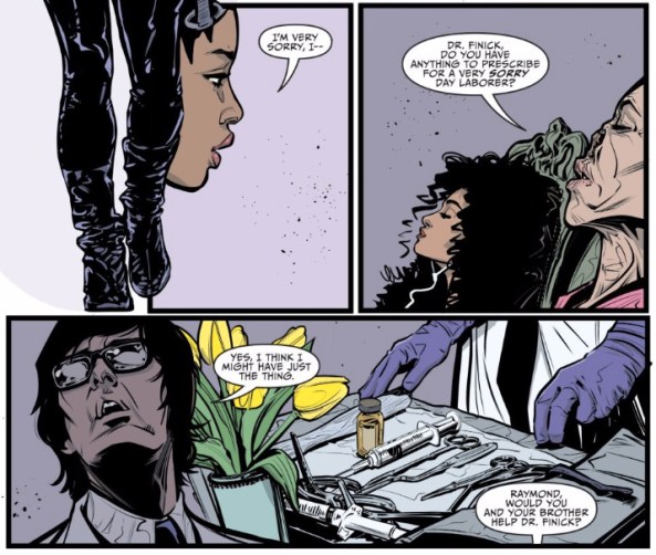 In the very next panel Dr. Finick smashes the impersonator’s hand with a hammer, but writer/artist Joëlle Jones uses the language and framing in the sequence above to present that as a “medical” solution, as just another tool in Creel’s endless twisted pharmacy. In that sense, it’s not just that Creel directs pain outwards rather than inwards; it’s that, while Selina is using pain to try to find peace, Creel finds joy in inflicting pain, creating chaos and conflict and strife. They’re quickly becoming two sides of the same coin.