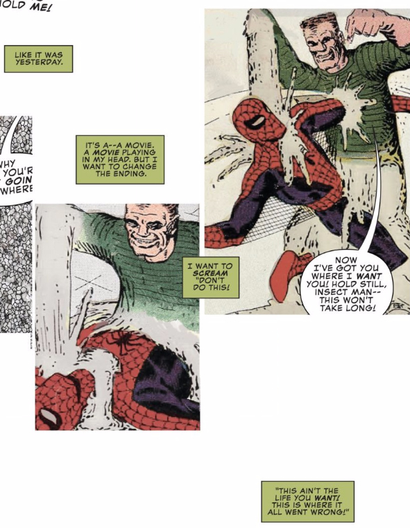 I say “particularly tricky” because I tend to think of Sandman as a rather one-dimensional character, defined more by his cool abilities than his personality or motives, and often used as a henchman, goon, or a cog in a supervillain group. Zdarsky acknowledges that by opening the issue with repurposed Stan Lee/Steve Ditko panels that highlight the superficiality of Sandman’s past characterization, but then uses Marko’s internal monologue to assert that there’s more to the character than the stereotypical villain we’ve seen in the past.