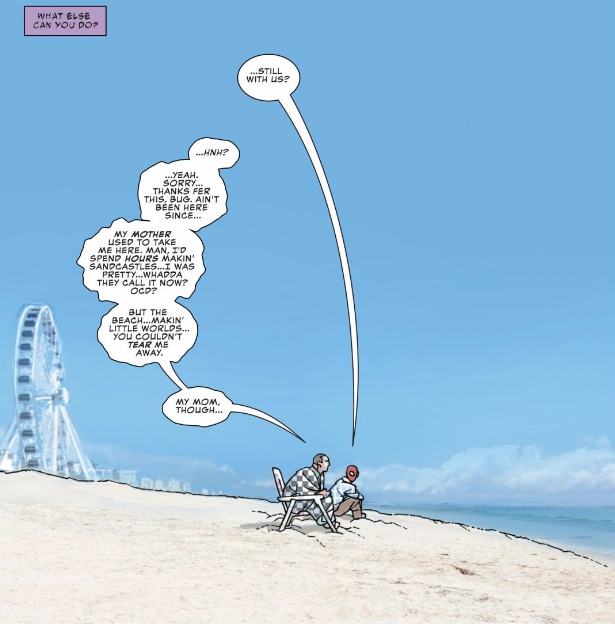 Eventually, though, Peter hears Marko out, understands the pain he’s feeling, and stops trying to fix things, honoring Marko’s requests and helping him face the end of his life with dignity and peace. It brings them closer together, figuratively but also quite literally, as Bachalo again highlights.