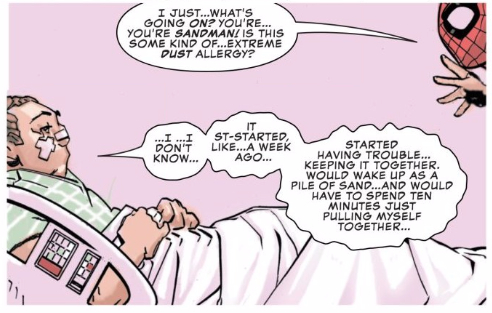 Artist Chris Bachalo then follows suit, presenting readers with a more complex Flint Marko, one whose pain, fear, and stress is evident on his face. It’s easy to sympathize with this take on Sandman, to see him as a human being rather than a caricature.