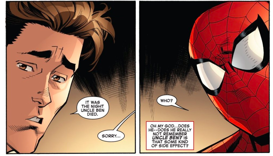 Another thing to point out is that since the Peter/Spidey separation, Peter remains the sole narrator of The Amazing Spider-Man. By giving this “responsibility” to Peter, Spencer underscores that there is no Spider-Man without Peter. Peter is a bystander in his own life and as our point of view, we are bystanders with him. By separating the man from the spider, Spencer reminds us why we are invested in this character, and it’s not for his powers, amazing they may be.